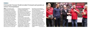 Herbst- und Helferfest 2025TREVERER TEUFEL unterstützen Trierer Stadtprinzenpaar 2025TREVERER TEUFEL unterstützen Trierer Stadtprinzenpaar 2025Erstmals nach 1997 stellte der KC Grün-Weiss Trier-Euren 1979 e.V., mit Christine II und Stephan I. von Euranien, wieder das Trierer Stadtprinzenpaar. Damals wurde unserem ehemaligen 2. Vorsitzenden, Udo Ringel, mit seiner Frau Mady, diese Ehre zuteil. Zwischenzeitlich regierte auch Ralf Geib (2013: Ralf der III). Die Regentschaft von Christine und Stephan war für uns TREVERER TEUFEL natürlich Anlass genug, UNSER Eurener Prinzenpaar zu unterstützen, und das nicht nur in der Prinzenbegleitung. Dieses hatte sich zum Ziel gesetzt, Spenden zu sammeln für eine tolle Aktion: ALLE aktiven Kinder ALLER Trierer Karnevalsvereine sollen einen Spielnachmittag im Trampoline, in Trier-Euren verbringen, finanziert durch Spenden. Bereits im Sommer 2024, an der Eurener Kirmes, wurden die Einnahmen vom Kräuterbaguette-Verkauf für diese Aktion bereit gestellt. Zusätzlich wurden die gesamten Einnahmen aus dem Losverkauf für die Tombola anlässlich der Herbst- und Helferfete, im September 2024, an der Kameradenhütte in Trier-Euren, an das damals designierte Prinzenpaar übergeben. Ferner wurden bei jeder Fahrt, welche unser Fanclub unternahm, ein Sparschwein durch die Reihen gereicht. Dieses Sparschwein wurde beim Faschingsstammtisch, Anfang Februar 2025 im Gasthaus Ernser, an dem auch das Prinzenpaar samt Gefolge teilnahm, noch einmal gut „gefüttert“. So konnten wir TREVRERER TEUFEL bei besagtem Stammtisch insgesamt 1.540,00 € für die tolle Aktion „unseres“ Prinzenpaares übergeben. Insgesamt haben die TREVERER TEUFEL, seit ihrem fast 25-jährigen Bestehen, bereits über 11.000,00 € für soziale Zwecke und für die Vereinsjugend in Trier-Euren gespendet. MIR SINN EUREN!!! Trierer Sekt für die Damen beim 1.FCKEs ist schon Tradition, dass die Damen auf der Geschäftsstelle sowie im Fanshop des 1.FCK von uns mit einem Sektgeschenk bedacht werden.Ein Anruf, eine Mail - das genügt, und schon haben wir unsere Kartenreservierung für das jeweilige Heimspiel! Das wird natürlich von uns „belohnt“! Nach 2 Jahren Coronapause konnte der Vorstand unseres Fanclubs endlich wieder dieser schönen Aufgabe nachkommen. Im Fanshop wurden wir (und auch die Sektkisten mit bestem BERNARD MASSARD-Sekt) freudig „in Empfang genommen“! Natürlich verband man den Besuch mit Einkäufen im Fanshop und einem gemeinsamen Essen in einem Pfälzer Gasthaus, bevor es wieder Richtung Trier ging. DANKE an die helfenden Mitglieder:innen!Nein, wir fangen jetzt nicht an zu „gendern“, wollen aber auch niemanden übergehen ;-)Die jährliche Herbst- und Helferfete konnte in diesem Jahr wieder stattfinden. So fand man sich im Vereinshaus des TuS-Trier-Euren 1969 e.V. ein, um gemeinsam zu feiern. An dieser Stelle noch einmal ein Dank an den TuS, der uns das Haus an diesem Tag überlassen hat! Natürlich waren ALLE Mitglieder mit ihren Familien eingeladen mitzufeiern, was auch regen Zuspruch fand. Traditionell wurde wieder eine Tombola aufgebaut. Zahlreiche lokale Sponsoren spendeten dafür. So konnten insgesamt 600 € an den DPSG Stamm St. Helena / Tempelherren (Pfadfinder) sowie an den Jugendförderverein des TuS Trier-Euren 1969 e.V. übergeben werden. Die Übergabe erfolgte auf dem Eurener Weihnachtsmarkt an die jeweiligen Vorsitzenden dieser Institutionen. Natürlich wurde auch für das leibliche Wohl der Anwesenden gesorgt. Hierzu wurden Teile des Essenangebotes aus der TEUFELSKÜCHE gereicht. Selbstverständlich wurden auch die 150 Liter KROMBACHER Pils angezapft, welche der 1.FCK unserem Fanclub anlässlich unseres 20-jährigen Bestehens hat zukommen lassen. Es wurde gefeiert bis in die Nacht, mit bester Laune… FCK-Fans spenden im Trierer Ortsteil Euren. Der Erlös der Tombola bei der Herbst- und Helferfete des 1.FCK-Fanclubs TREVERER TEUFEL e.V. wurde auch in diesem Jahr wieder für soziale Zwecke gespendet. So konnte der Vorstand des Fanclubs jeweils einen dreistelligen Geldbetrag an den Jugendförderverein des TuS Trier-Euren 1969 e.V. sowie an die DPSG Trier-Euren, Stamm Tempelherren übergeben werden. Die Übergaben an die jeweiligen Vorsitzenden der beiden Institutionen erfolgten auf dem Eurener Weihnachtsmarkt. (Quelle: Wochenspiegel Trier) Endlich wieder Eurener Kirmes - aber anders…Die Coronapause hat ein Ende und endlich konnten wir wieder unseren Essenstand TEUFELSKÜCHE aufbauen.Allerdings fand die Eurener Kirmes in diesem Jahr an einem anderen Standort statt! Aus organisatorischen Gründen wurde der Kirmesplatz verlegt, in die Ottostraße in Trier-Euren, auf das Betriebsgelände der Firma BERNARD MASSARD. Alles war etwas anders und ungewohnt, bis der gewohnte Knoblauchgeruch über den Kirmesplatz strich und man feststellte: im Essenstand ist alles wie früher. Viele Helferinnen und Helfer (rund 70 an der Zahl) halfen mit bei Auf-/Abbau, Vorbereitung, Standdienst, etc.! Von Freitag bis Sonntag wurde alles verkauft, was die TEUFELSKÜCHE hergab - der Rest wurde an der Nachkirmes, am folgenden Donnerstag verkauft. An dieser Stelle nochmals ein großes Dankeschön an alle, die geholfen haben!!! Ehrung 2021Nun besann sich der 1.FCK, alle Fanclubs, welche im Jahr 2020 ihr Gründungsjubiläum begingen, entsprechend zu ehren. Diese Ehrung fand vor dem Heimspiel gegen den SV WIESBADEN-WEHEN, am 20.11.2021, im Fritz-Walter-Stadion, vor der Westtribüne, statt. Die Urkunde sowie das Jubiläumsgeschenk wurden durch den 2. Vorsitzenden der TREVERER TEUFEL, WOLFGANG MÖLLER, sowie den Beisitzer DANIEL BASTEN entgegengenommen. Der würdige Rahmen wurde durch den 1:0-Sieg des 1.FCK abgerundet. Die nachzuholende Jubiläumsfeier wird hoffentlich im kommenden Jahr stattfinden können. Die Getränke sind schon einmal gesichert: Als Jubiläumsgeschenk wurde dem Fanclub ein Gutschein über 150 (!) Liter KROMBACHER Bier übergeben! Ex-FCK-Profi Thomas Richter beim Stamm